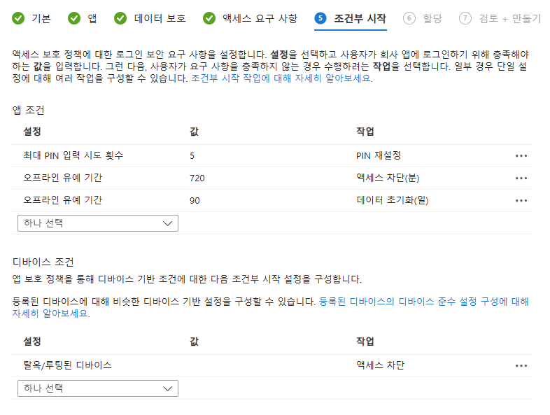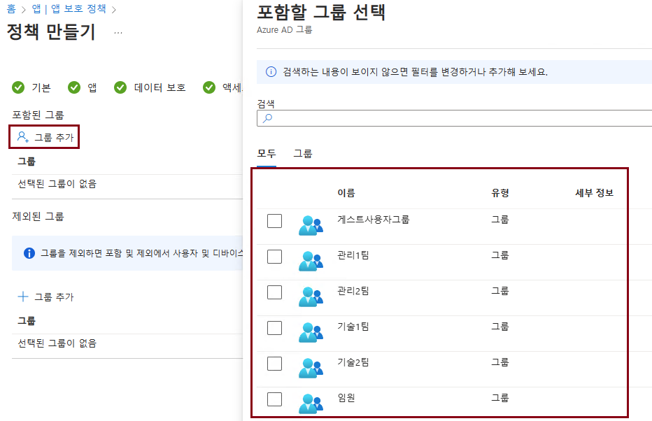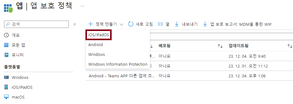 [https://Intune.microsoft.com (인튠 관리센터) 접속] - [앱] - [앱 보호 정책] 클릭해주세요