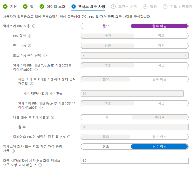 테스트 이므로 액세스 요구 사항은 필수 아님으로 변경 후 진행했습니다