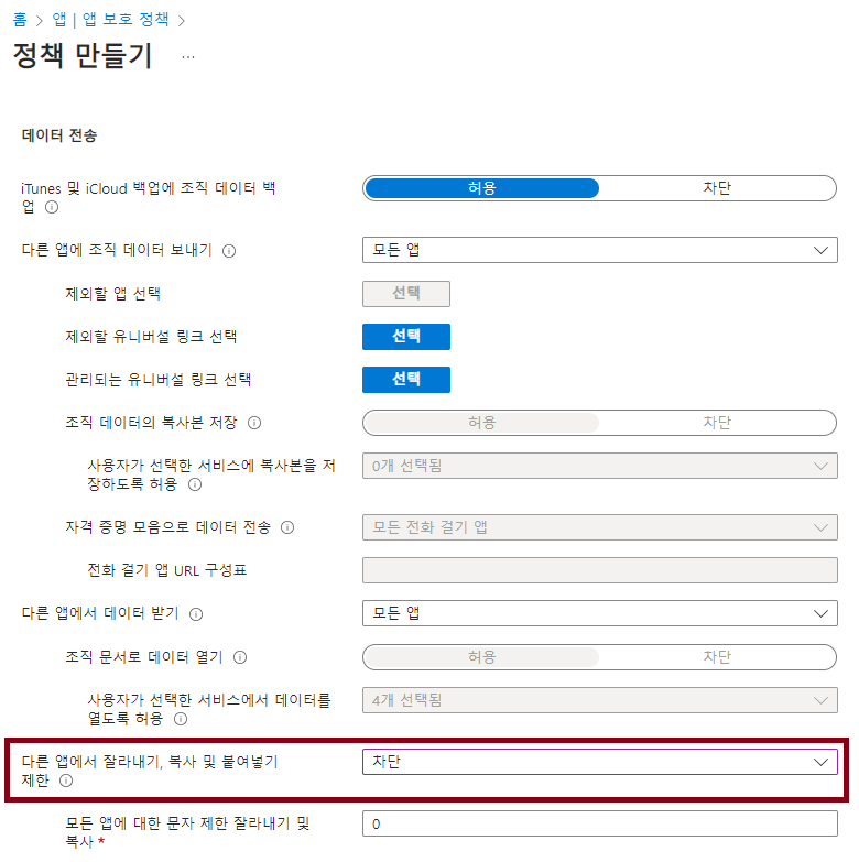 정책 중에서 "다른 앱에서 잘라내기, 복사 및 붙여넣기 제한"을