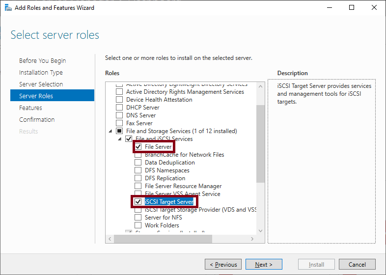 File Server와 iSCSI Target Server 두 가지 역할을 추가해주시고 설치를 완료해주세요