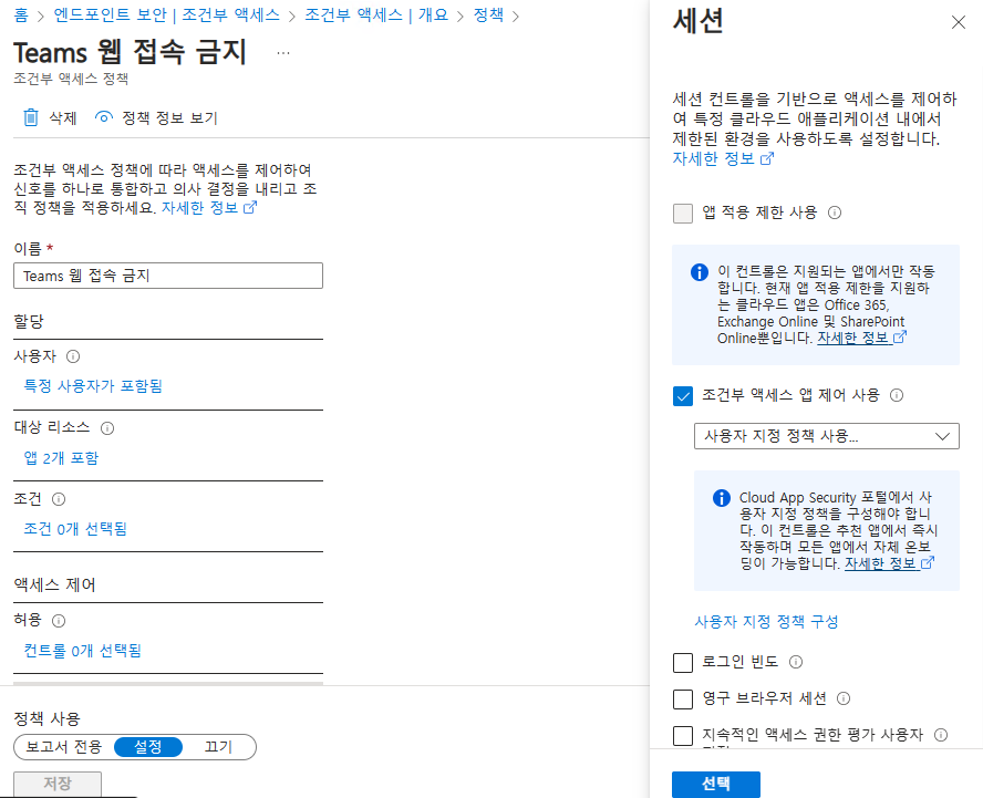 특정사용자가 Teams에 로그인 하는 경우 세션이 조건부 액세스 앱 제어의
