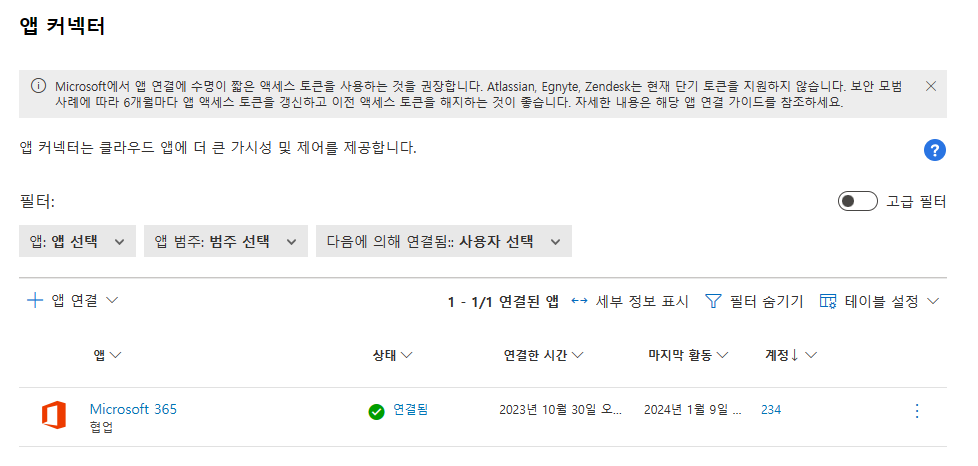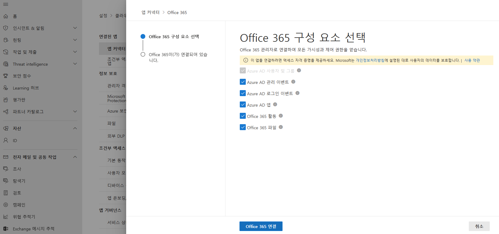 [설정] - [클라우드 앱] - [연결된 앱] - [앱 커넥터] - [앱 연결] - Office 365