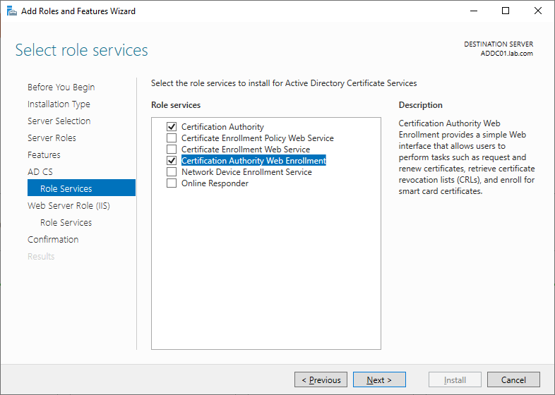 Certification Authority / Certification Authority Web Enrollment 역할 서비스 추가 후