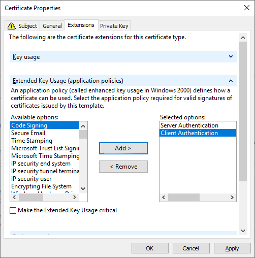 Extensions Tap의 Available Options에서 Client Authentication을 추가해주세요