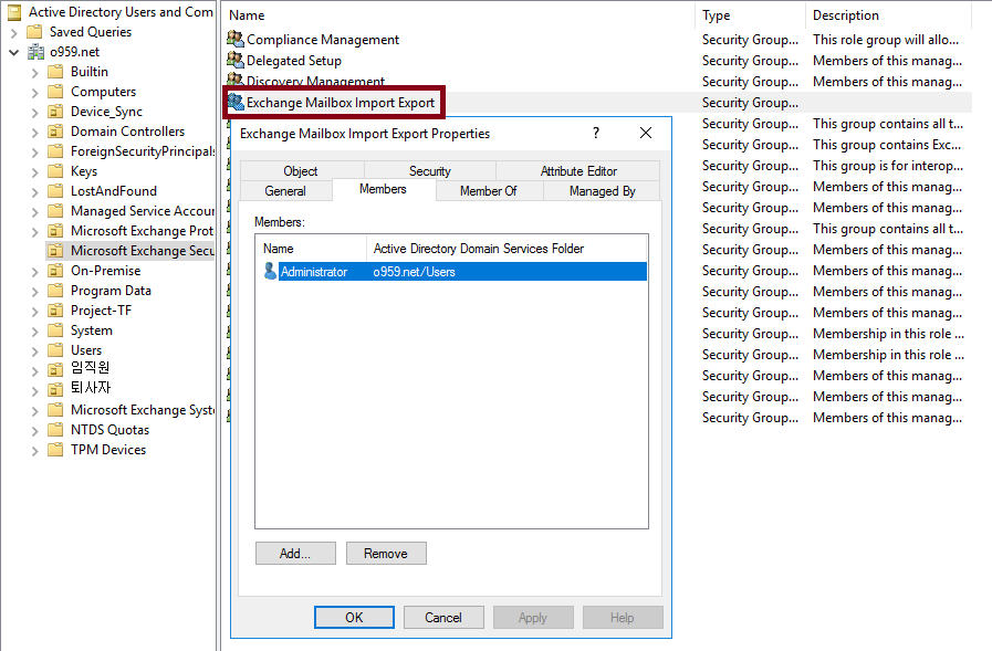 Exchange Mailbox Import Export {Mailbox Import Export} {Mailbox Import Export-Exchange Mailbox Import Export} {o959.net/Microsoft Exchange Security Groups/Organization Management, o959.net/Users/Administrator}