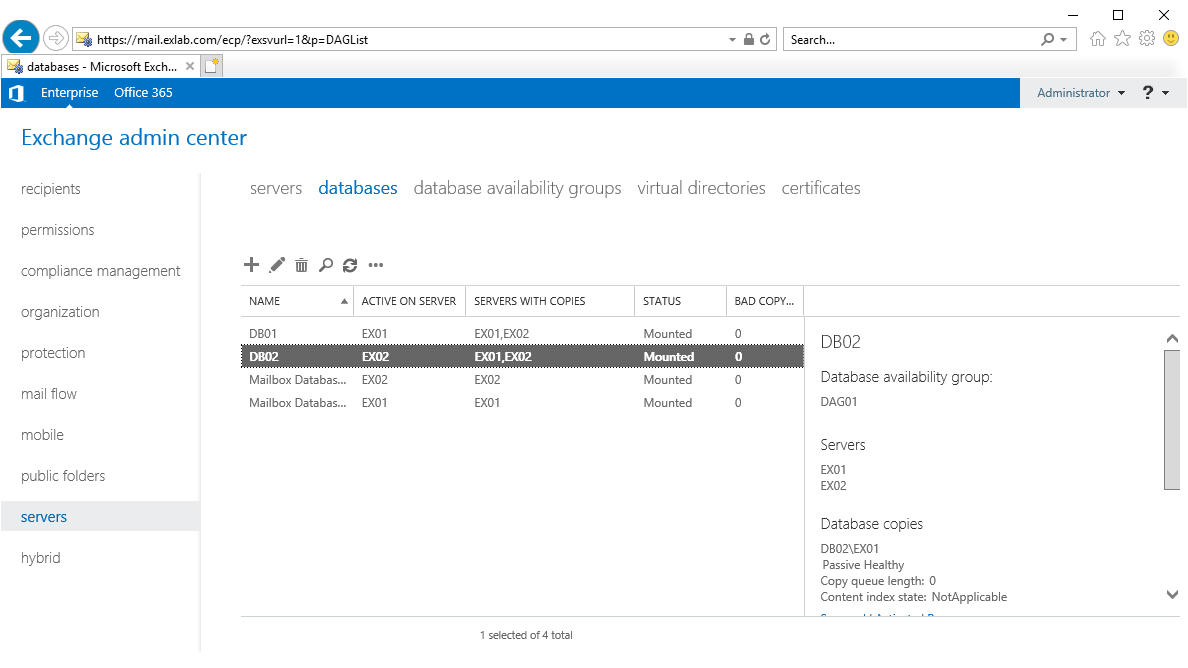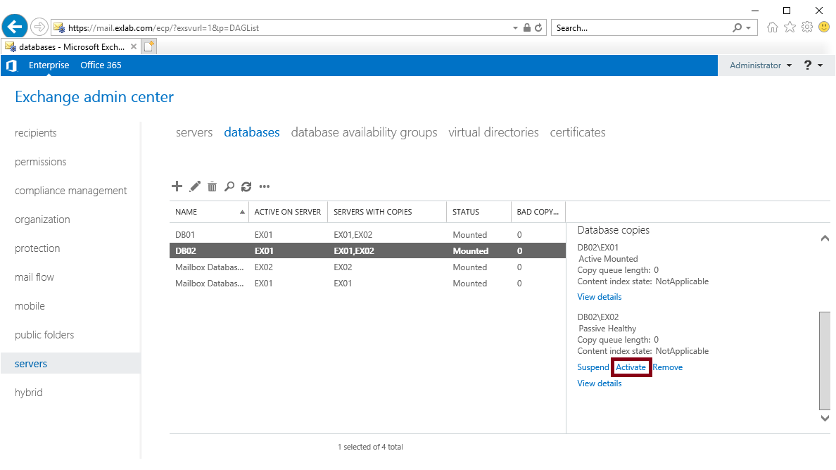 Move-ActiveMailboxDatabase -Identity DB02 -ActivateOnServer EX02