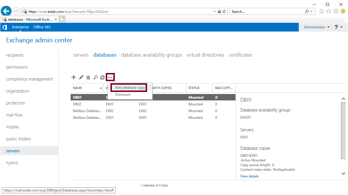 복사본을 만들 Database를 선택한 뒤 Add Database Copy를 클릭해주세요