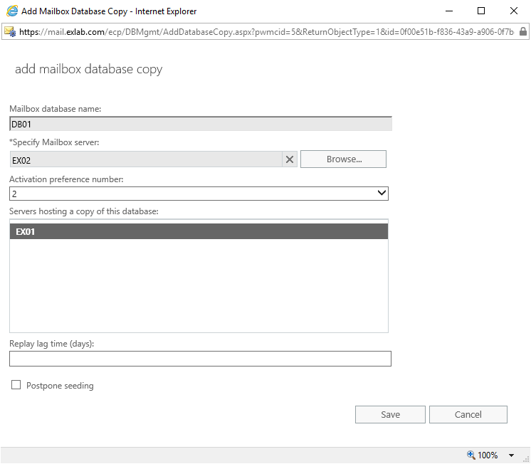 Add-MailboxDatabaseCopy -Identity DB01 -MailboxServer EX02 -ActivationPreference 2