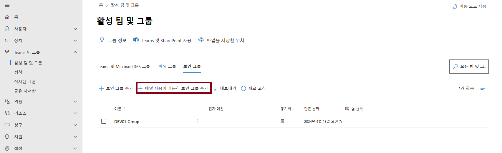 Microsoft 365 관리센터에서 "메일 사용이 가능한 보안 그룹 추가"를 클릭해서 그룹을 만들어주세요