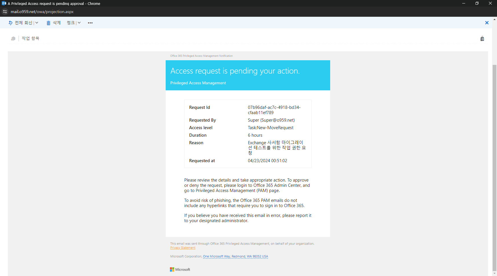 생성된 요청은 승인자 그룹으로 메일로 요청이 제출 되네요