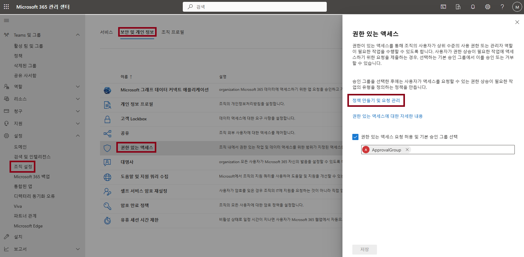 [권한 있는 액세스 요청 허용 및 기본 승인 그룹 선택] 체크 후