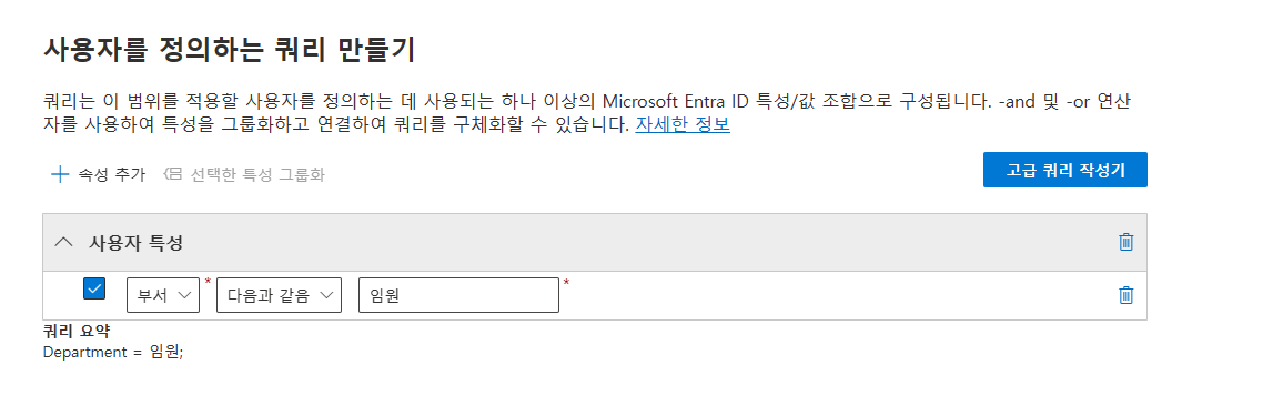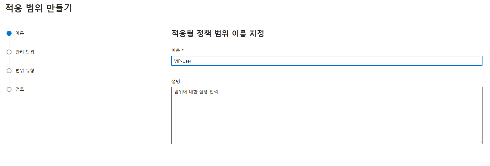 조직의 사용자/그룹 또는 사이트를 정의하는 특성으로 적응형 정책 범위를 만들어서 대상으로 사용해요