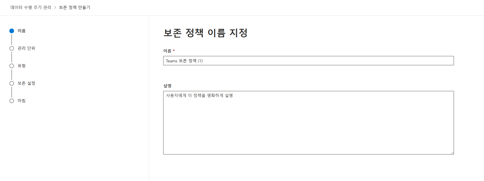 정책 이름 지정 : Teams 보존 정책 (1)