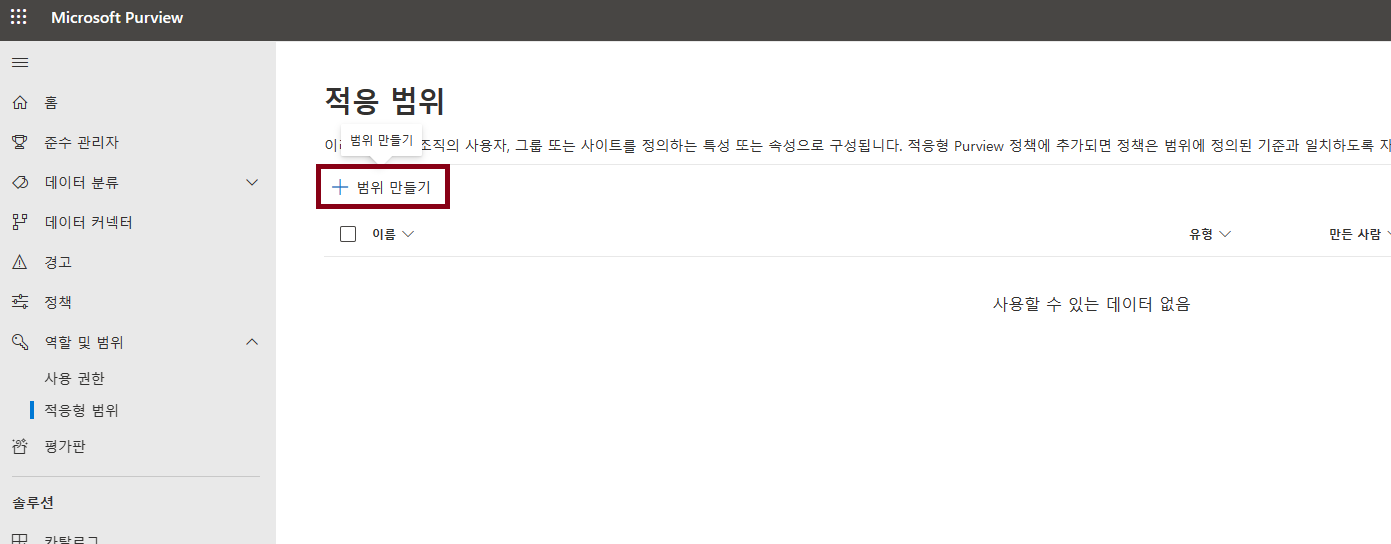 적응형 범위를 생성하기 위해 [범위 추가] - [지금 적응형 범위 만들기]를 클릭해주세요