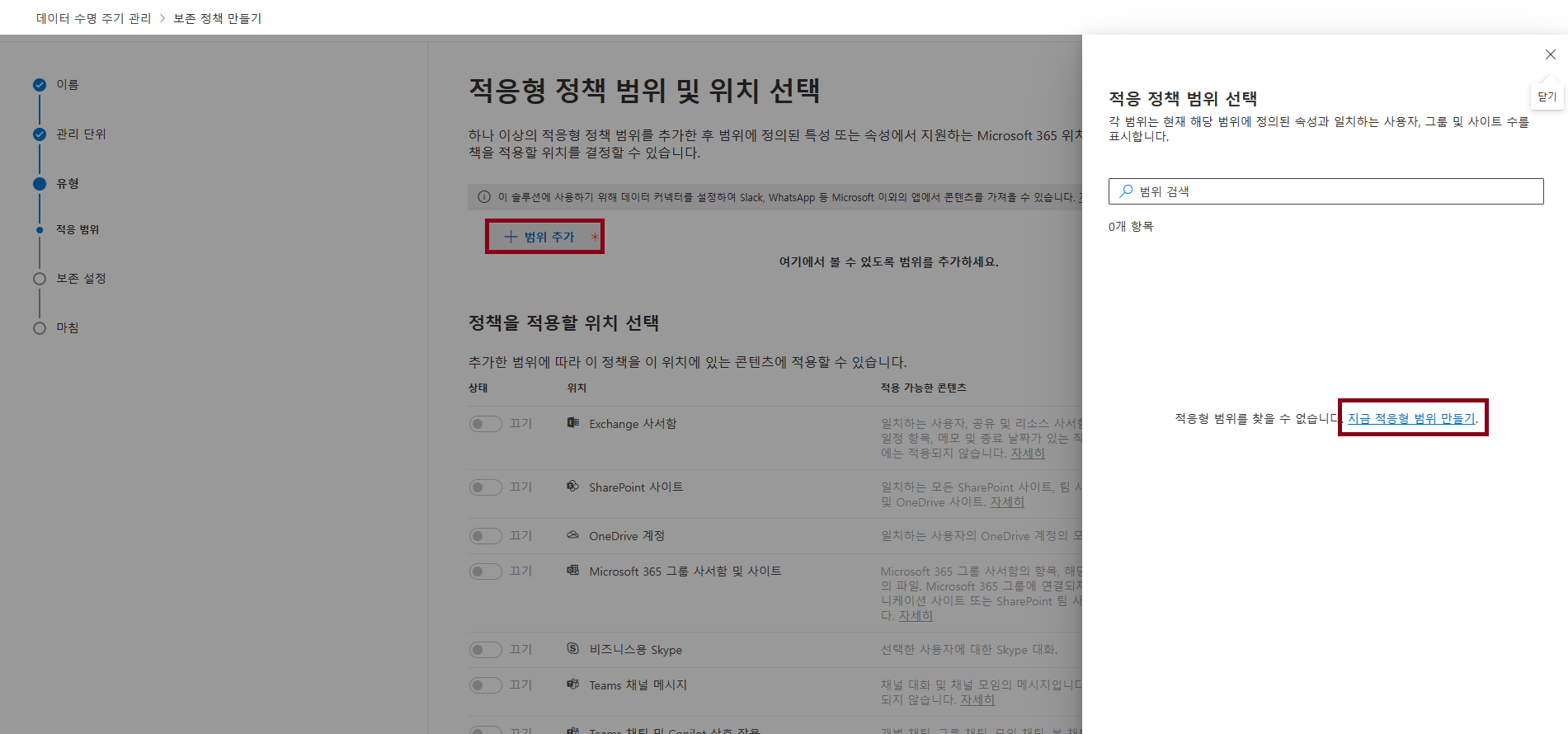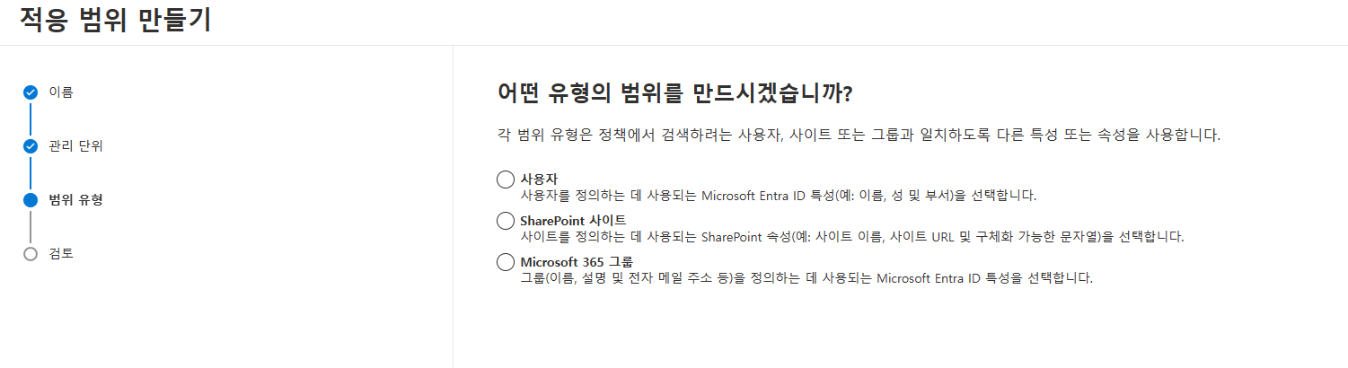 대상 범위를 Exchange 사서함, OneDrive 계정 등으로 범위를 지정해서 사용해요