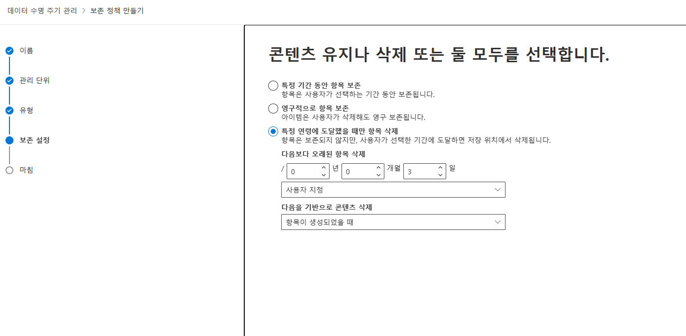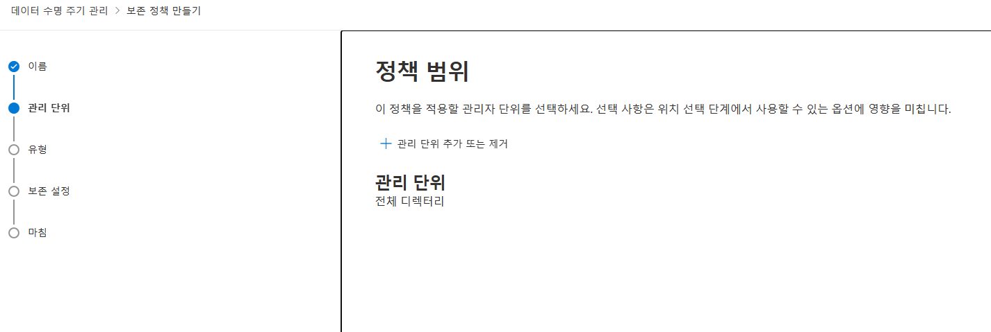 [Microsoft Purview 포탈] - [데이터 수명 주기 관리] - [Microsoft 365] - [보존 정책] - [새 보존 정책] 클릭