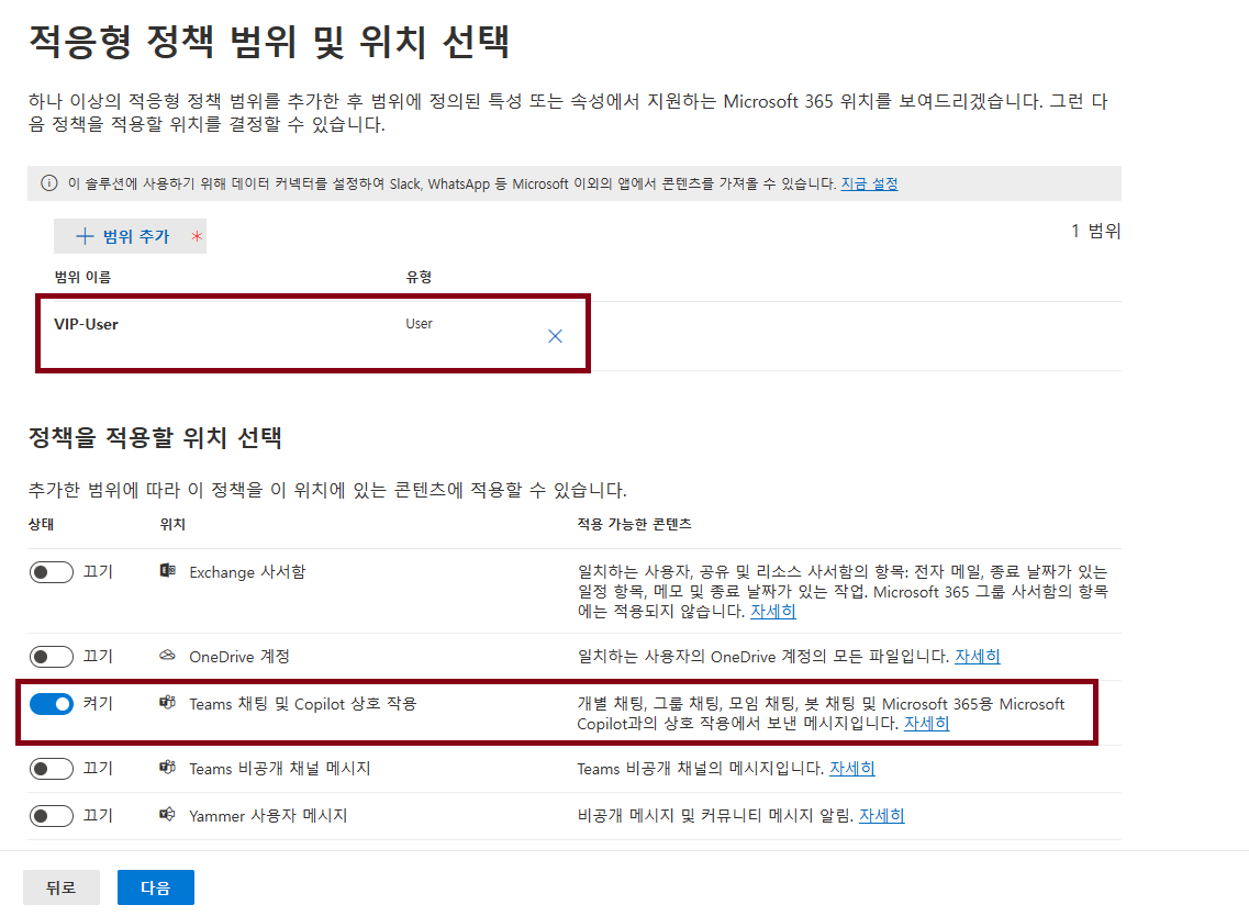 선택해주시고 적용 위치는 Teams 채팅 및 Copilot 상호 작용을 선택했어요