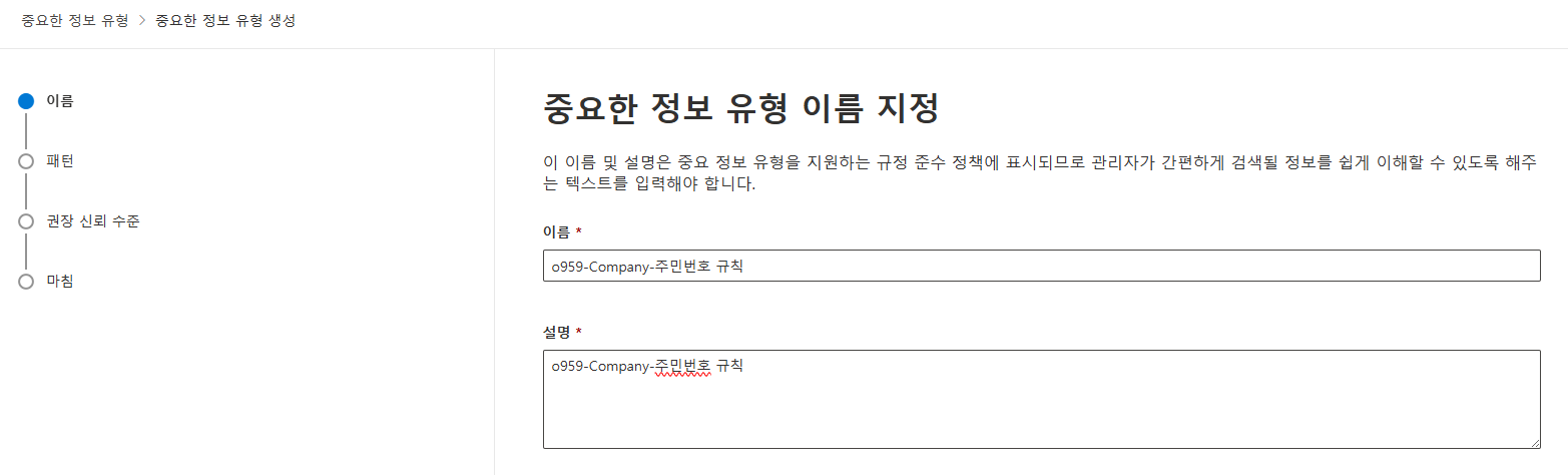 Purivew 포탈 - [데이터 분류] - [분류자] - [중요 정보 유형] - [중요한 정보 유형 생성]