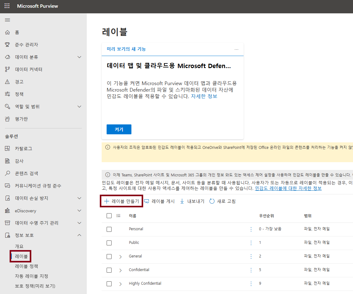 Purview Portal - [정보 보호] - [레이블] - [레이블 만들기] 클릭