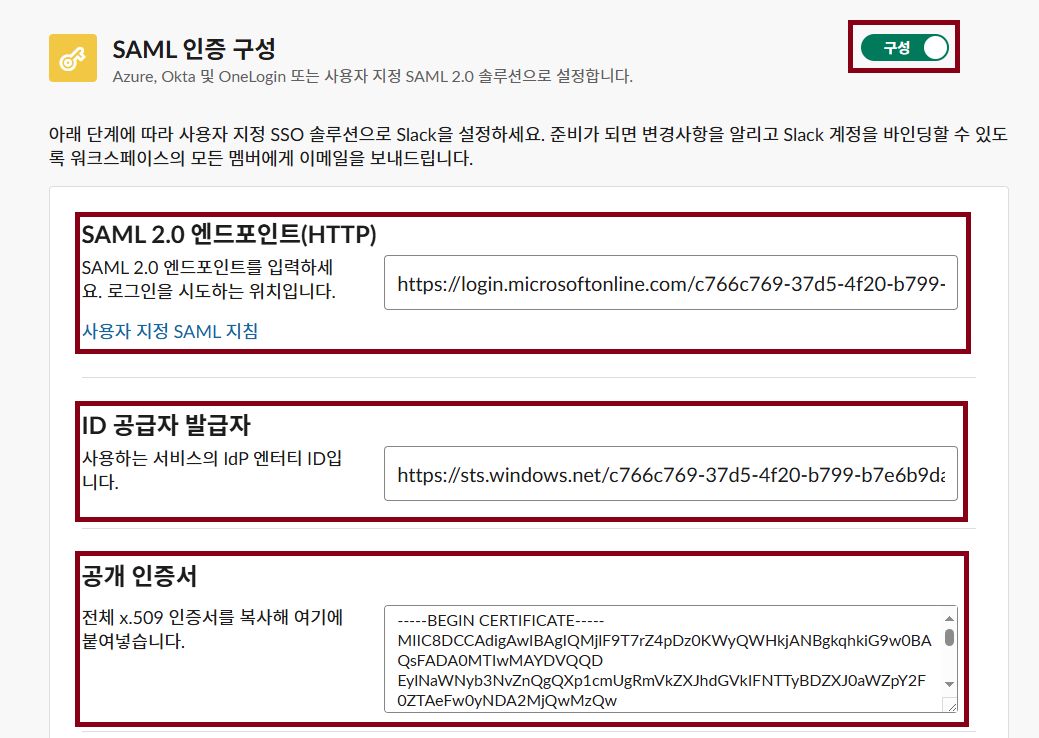 Slack SAML 인증 구성 페이지에 접속해주세요