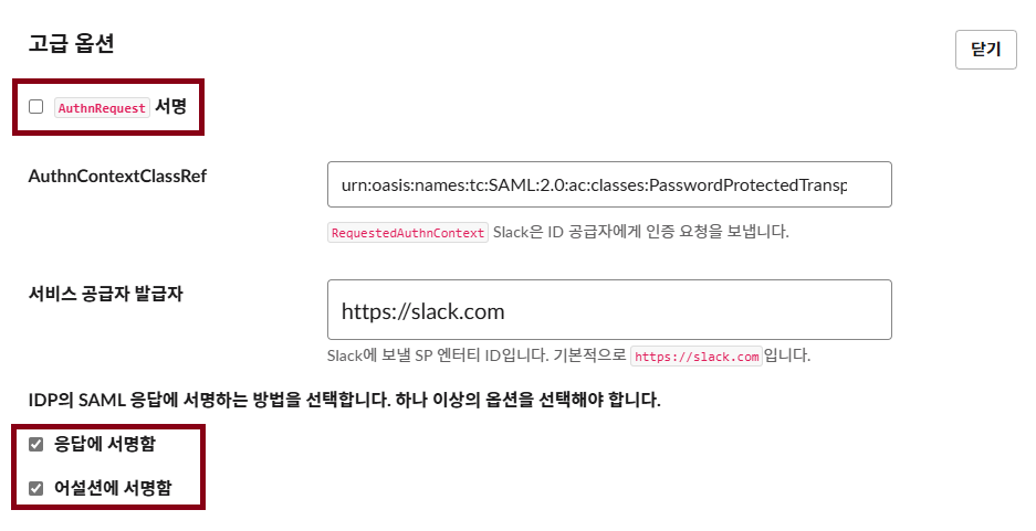 Slack SAML 인증 구성 페이지에 접속해주세요