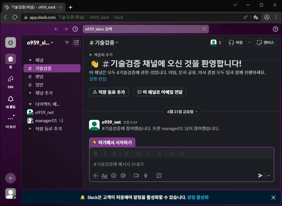 https://<domainname>slack.com으로 접속해주세요