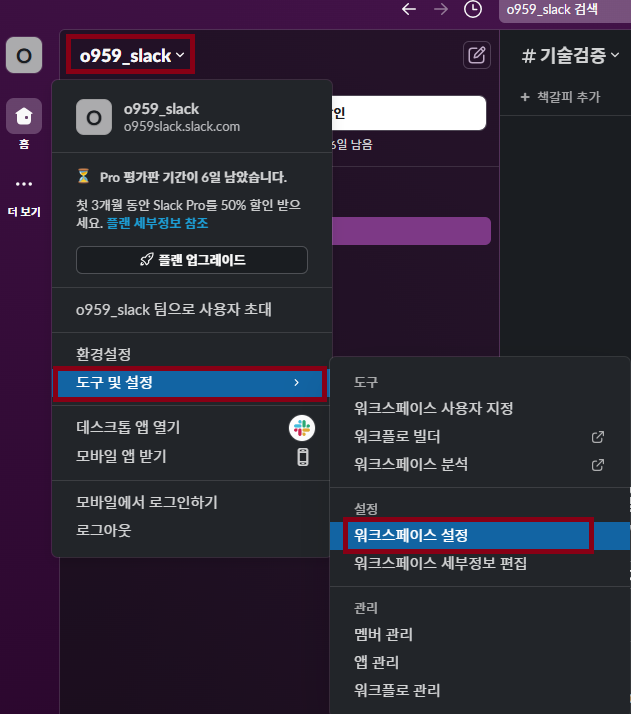Slack SAML SSO 설정을 위해 자신의 계정 클릭 - [도구 및 설정] 클릭 - [워크스페이스 설정] 클릭