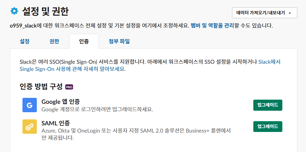 현재 SAML 인증을 구성할 수 있는 권한이 없어서 "업그레이드"라고 나옵니다.