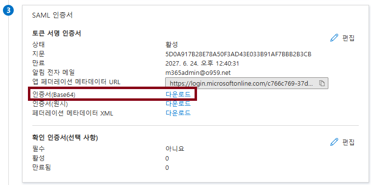 SAML 인증서를 다운로드를 클릭해서 다운받아놔주세요