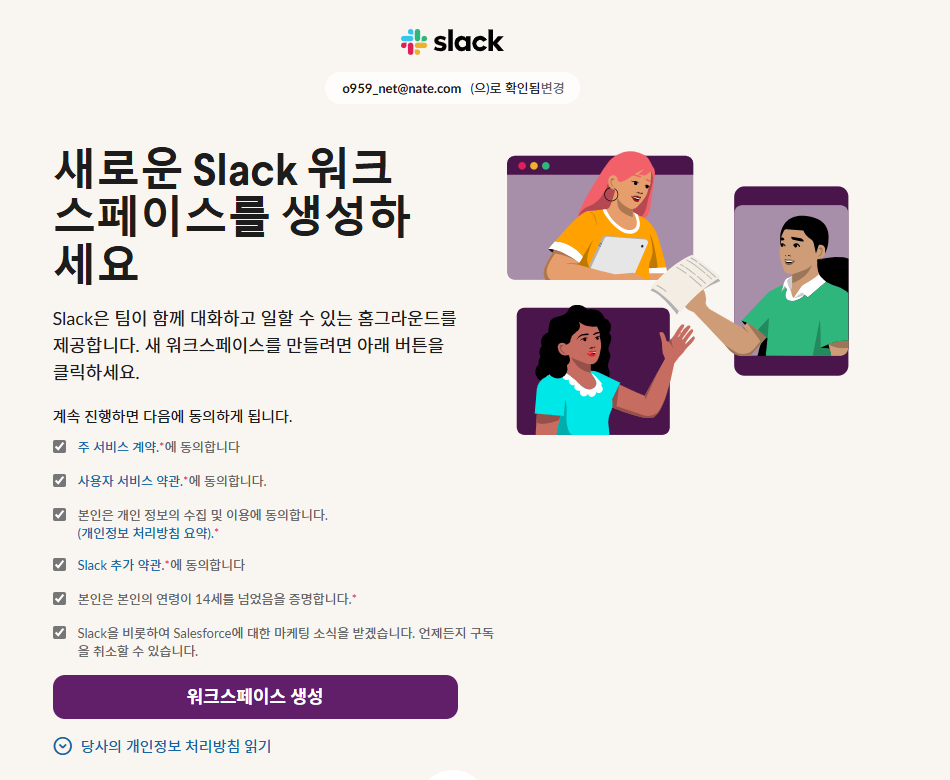 Slack 사이트에 접속하여, 새로운 계정을 생성해주세요