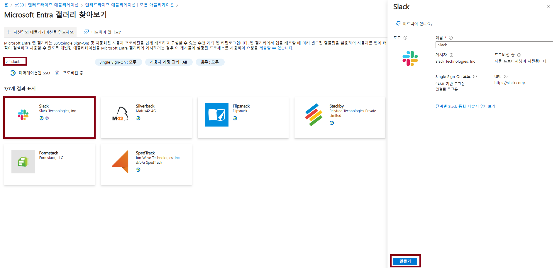 Entra ID 엔터프라이즈 어플리케이션 - Slack 검색해서 만들기