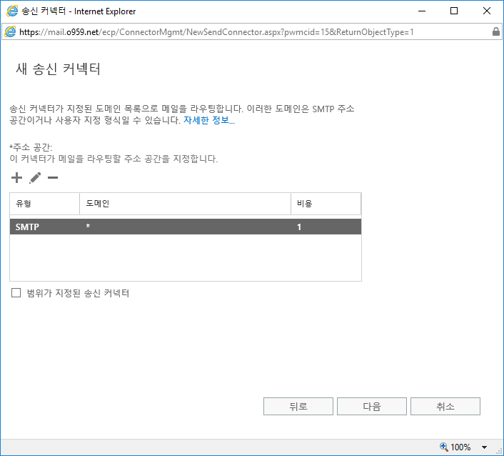 송신커넥터의 이름을 지정해주시고 유형을 "사용자 지정"으로 지정해주세요
