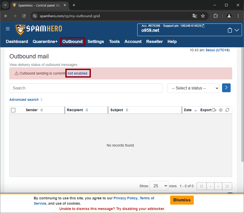 Spam Hero 사이트에 접속하여 로그인 후 [Outbound] - Not Enabled를 클릭하여 Enable로 변경해주세요
