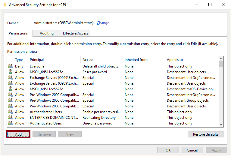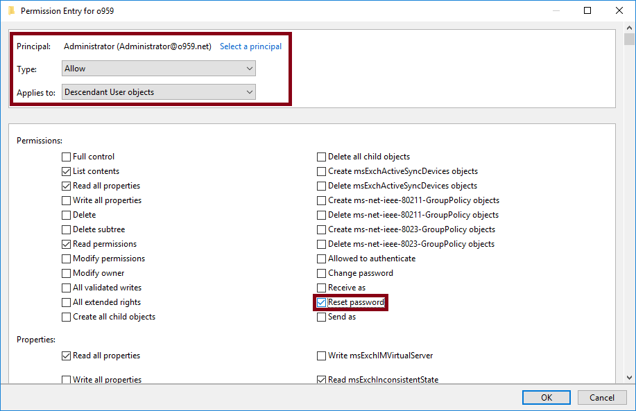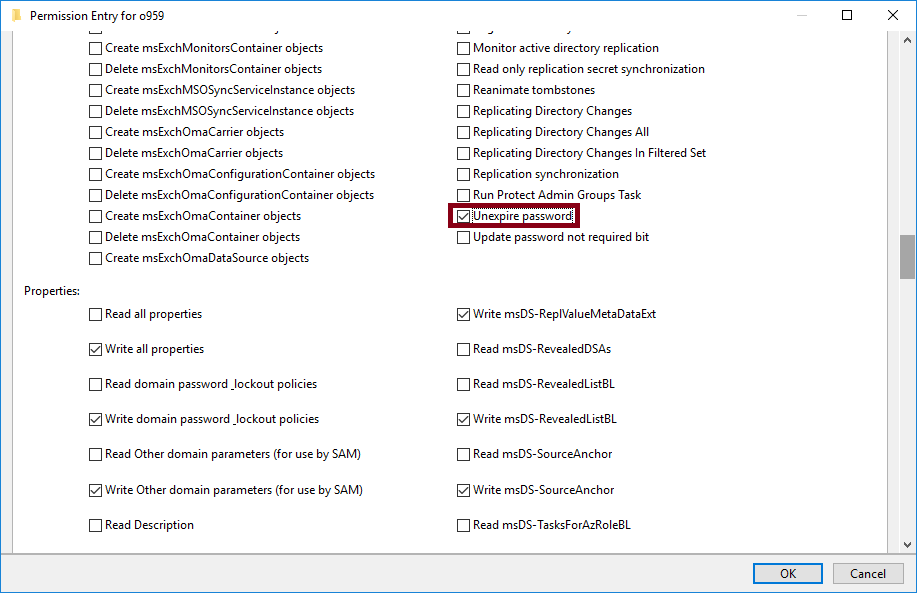 그리고 Reset password, Write lockoutTime, Write pwdLastSet 3개의 권한을 추가해주세요