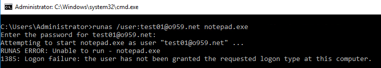 그리고 On-Premise AD 서버에서 변경된 패스워드를 이용하여 Runas로 notepad.exe를 실행해보니