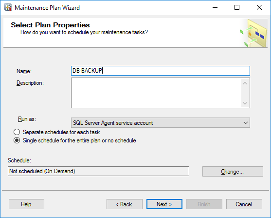 유지 관리 계획의 이름을 작성해주시고 Next (스케쥴은 마지막에 설정하려고 해요)