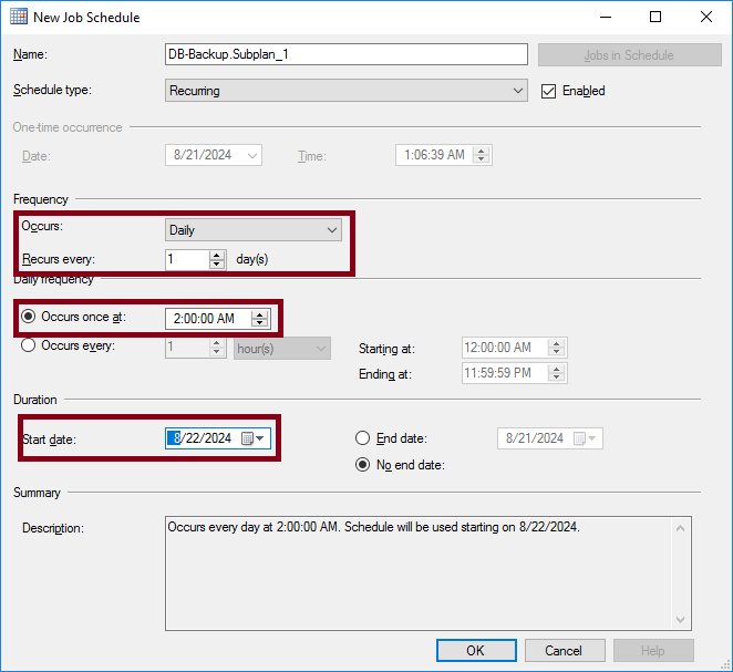 전 위처럼 매일(1일마다) 새벽2시에 2024년 08월 22일부터 스캐줄을 실행하는 것으로 설정했어요