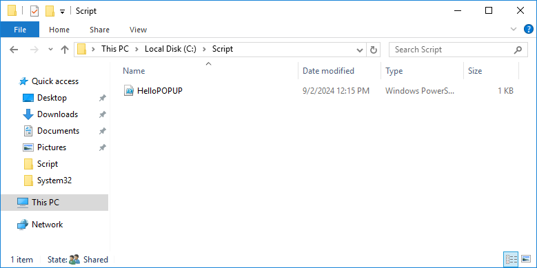 경로는 공유폴더이고 실행할 스크립트명(Hellopopup.ps1)도 지정해주세요