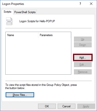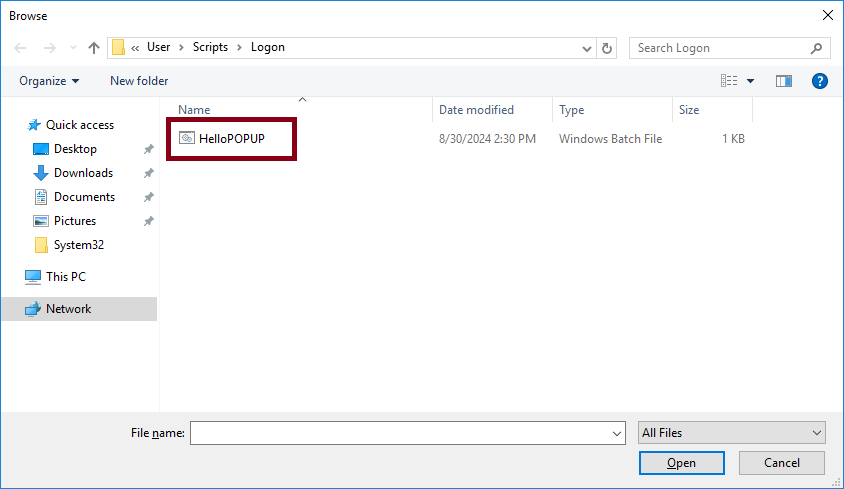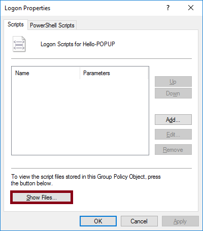 powershell.exe -executionpolicy bypass -windowstyle hidden -noprofile -file "\\ADDC01\share\HelloPOPUP.ps1"