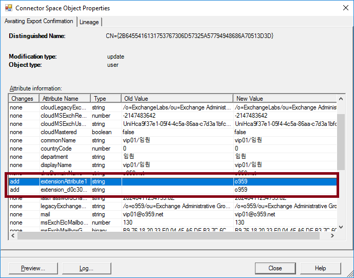 이전에 추가했던 ExtensionAttribute1의 값인 o959가 정상적으로 Sync 된게 확인 되네요