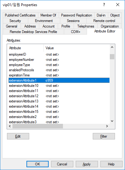 동기화 전 테스트를 위해 vip01이라는 계정에 extensionattribute의 값을 o959로 입력해줬어요
