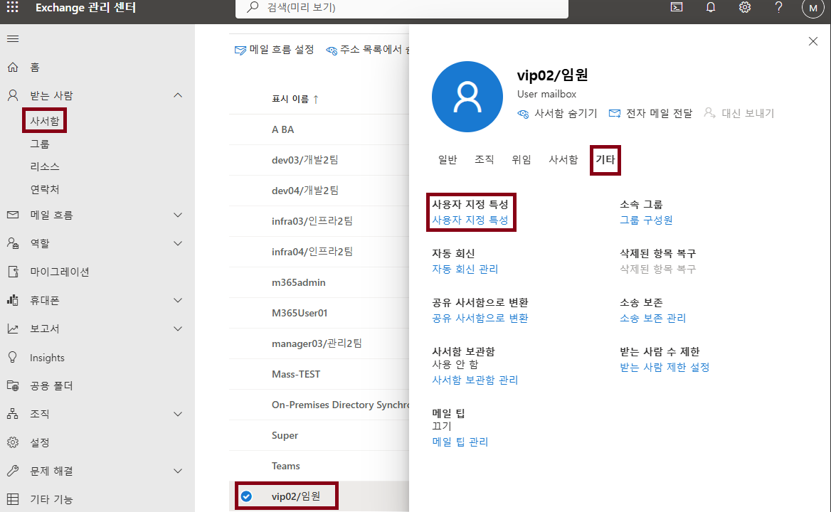 Exchange 관리센터 - 받는사람 - 사서함 - 확인이 필요한 계정(메일박스) 클릭